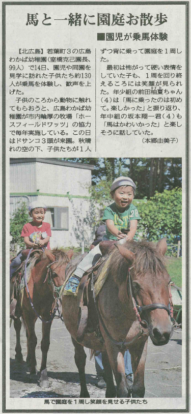 HOME > Blog-北広島わかば幼稚園 > 昨日の乗馬が新聞に載ったー!! 2015年9月15日 昨日は乗馬体験日で幼児体験日と… 賑わいのある一日です。 さらに北海道新聞に昨日の乗馬体験が載りました!! 地方版ですが… そして子ども達の様子は… 年長クラスは乗るだけではなく触れ合います。 年中さくら組 年少たんぽぽ組 園児は全員楽しんで乗っていたようです。 たまに固くなっている子もいましたが… 2月には馬そりに乗るのでお楽しみに!! 関連 Post Share note -Blog-北広島わかば幼稚園, お知らせ‐北広島わかば幼稚園 -おしらせ, 会、体験, 日常, 未就園児、ちびっこランド, 行事